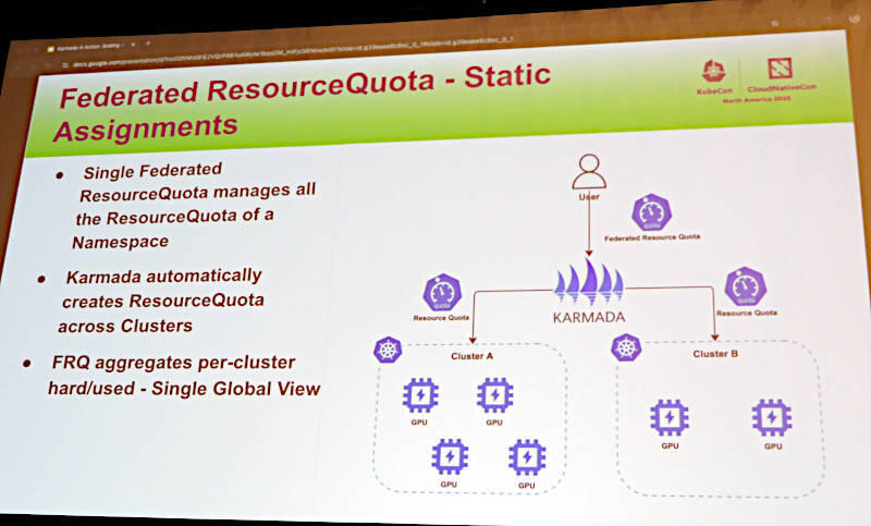 ここでWei-Cheng Lai氏にプレゼンテーションを交代。ここからはクラスターが持つGPUなどのリソースをマルチクラスターで管理するためにはクォータ(上限)を管理する必要があることを解説した。