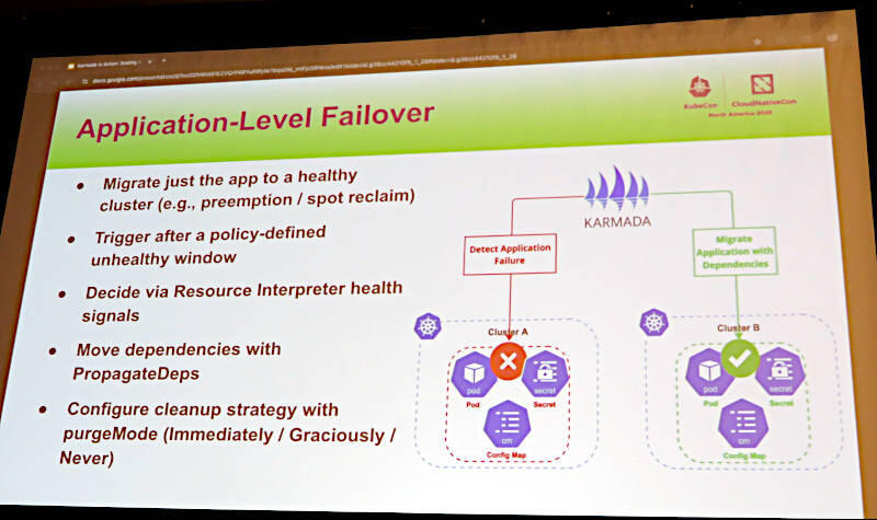 アプリケーションレベルのフェイルオーバーについてもKarmadaで実装されていることが説明され、クラスター間の再スケジューリング/フェイルオーバー、クラスター内のオートスケール、アプリケーションレベルでのフェイルオーバーなど多くのユースケースを想定して、KarmadaがBloombergのAIアプリケーションを可能にしていることが解説された。