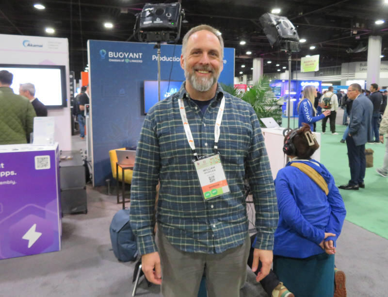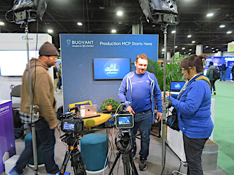 ブースを企業やプロダクトの宣伝のために使うのではなく、Linkerdのユースケースやユーザーからのコメントを残すための動画撮影にのみ使うというやり方は、The New StackなどのWebメディアに見られるスタイルだが、それをソフトウェアベンダーが採用するのは稀だろう。GitHub UniverseなどではMicrosoftがブースの中に対談スペースを作ってそこでPodcastや動画配信をしていたが、Buoyantのように自社ブースをまるごと使って行っていたのは非常に珍しい。Morgan氏にそのことを訊くと「マーケティングの担当が発案したやり方で特に口出しはしないことにした」とコメントしていた。