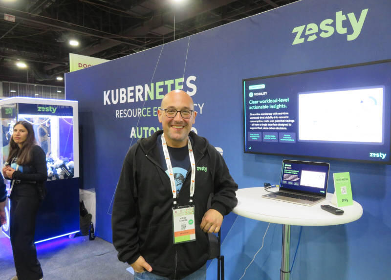 これはKubernetesのコストを最適化するソリューションを展開するZestyのブースで、ポーズをとっているのがR&Dリーダー、Mark Serdze氏だ。Serdze氏へのインタビューは別稿で紹介する予定だ。