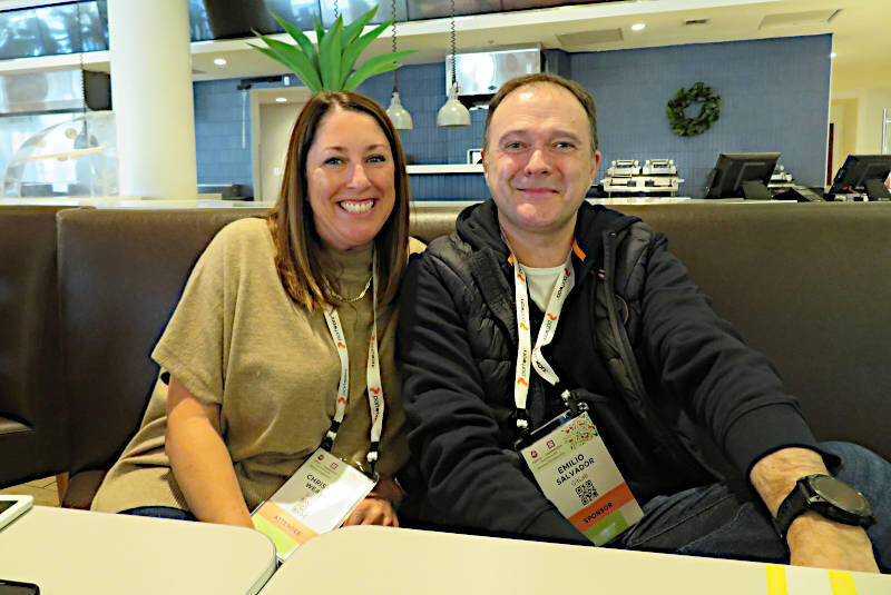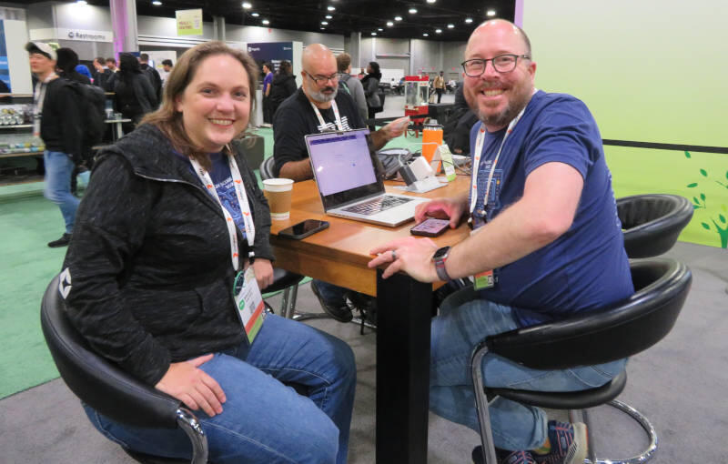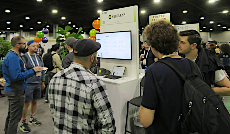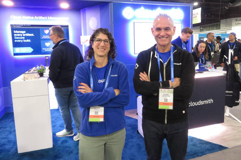 アイルランドのベルファストで起業したアーティファクト管理のためのツール、Cloudsmithのブース。立っているのはマーケティングのVP、Juliana Kelly氏(左)とCEOのGlenn Weinstein氏(右)だ。この2名にもインタビューを行っているので別稿にて紹介する。