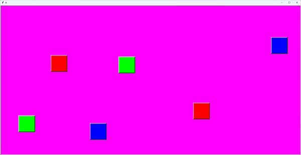 赤緑青の色ブロック画像を読み込んで表示します。色ブロックは画像ですが、ラベルではなく1つのキャンバスの中に複数表示します。まだ色ブロックは移動しませんが、クリックして背景色に色を混ぜて真っ白になったらステージクリアです(図5)。