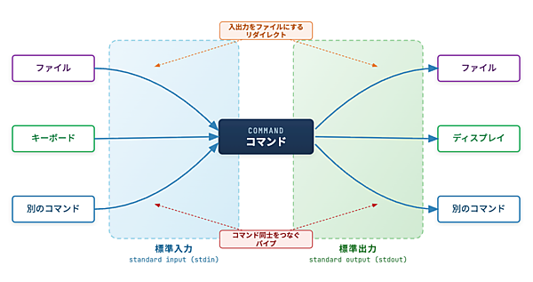 これまでの連載では、Linuxの標準入力や標準出力を繋ぎかえる「パイプ」や「リダイレクト」を何度も利用してきましたが、これらの仕組みについてはしっかり体系立てて解説をしていませんでした。そのため、普段からコマンドは利用しているものの、このあたりを