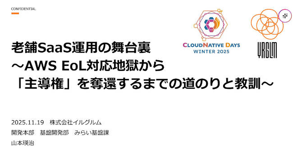 CloudNative Days Winter 2025で行われたセッション「老舗SaaS運用の舞台裏~AWS EoL対応地獄から「主導権」を奪還するまでの道のりと教訓~」では、クラウド時代のSaaS運用が直面する現実的な課題が語られた。登壇したのは、株式会社イルグルムの開発本部 基盤開発部 みらい基盤課の山本瑛治氏。20年近く運用されてきた老舗SaaS「AD EBiS」をAWSへと移行する中で、EoL対応に翻弄され続けた現場が、いかにして受け身の運用から脱し、主導権を取り戻していったのか。