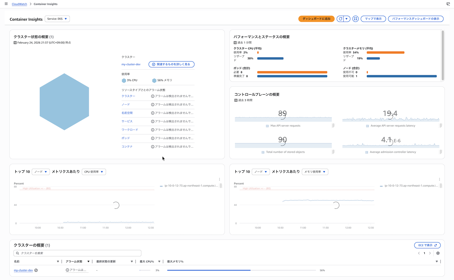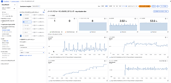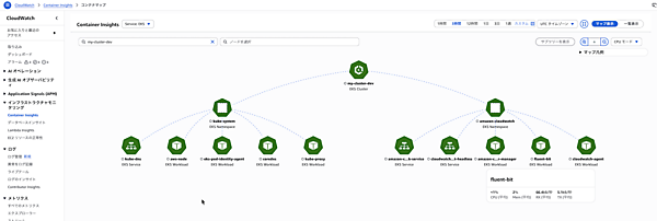 今回は、収集されたメトリクスをどのように確認し、活用するかを見ていきます。Container Insightsが有効化されると、CloudWatchコンソールに専用のダッシュボードが表示されます。