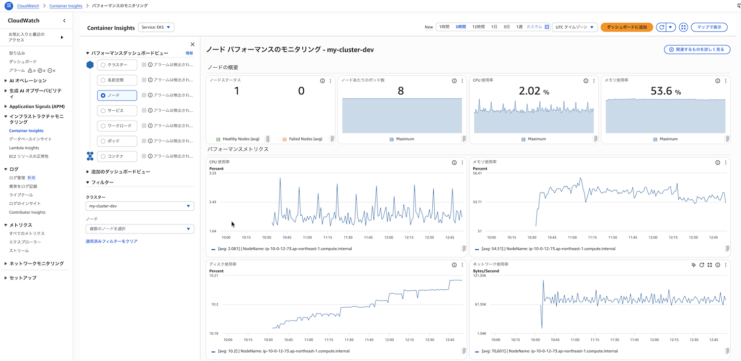 開発環境ではContainer Insightsを無効化してコストを削減し、本番環境でのみ有効化するという運用も検討できます。開発環境では基本的なメトリクスのみで十分な場合が多く、詳細な監視は本番環境に集中させることでコストを最適化できます。