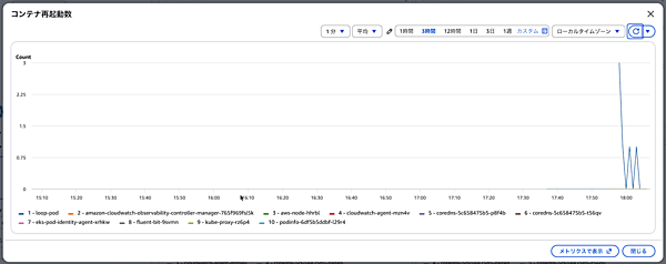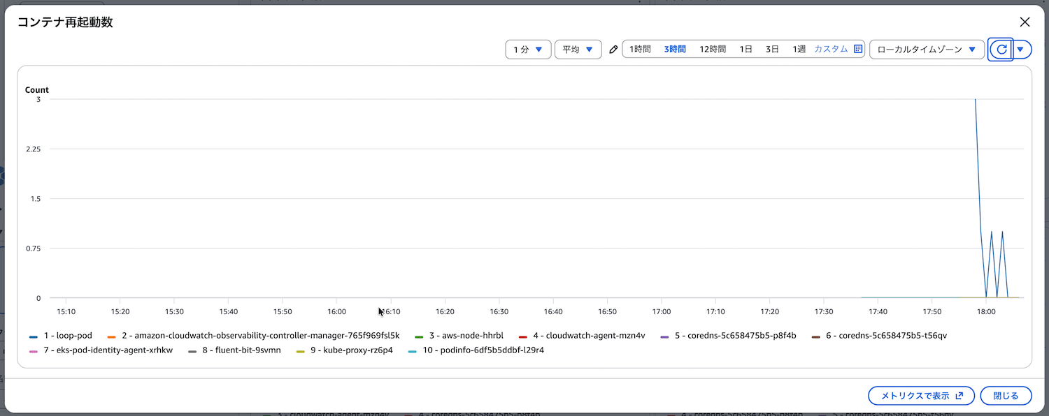 - Container Insightsで異常なメトリクスを発見(例:特定のPodで再起動が頻発)
