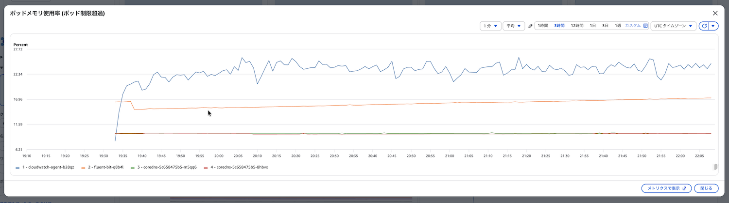 アプリケーションの開発を続けていくと、いつの間にかPodのメモリ使用量が増えていたり、特定のPodだけリソース消費が多くなったりすることがあります。デプロイ直後にメトリクスを確認するのとは別に、週次または月次でContainer Insightsのダッシュボードを確認し、負荷の傾向が変わっていないかをレビューしましょう。