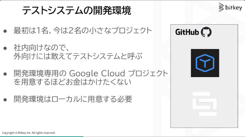 一方で、開発環境専用にクラウドプロジェクトを用意するほどのコストはかけられない。酒井氏は「開発環境はローカルに用意する必要がありました」と言い、制約条件を率直に示した。セッションは、このローカル縛りという前提のもとで、いかに本番に近いクラウドネイティブ開発環境を実現していったのか、その道筋を明らかにしていく。