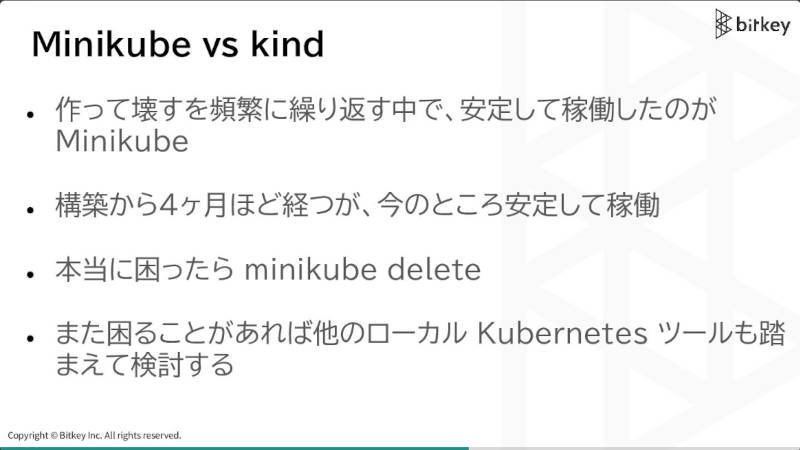ローカルKubernetes環境としては、当初Kindも検討されたが、最終的にMinikubeが選択された。クラスタの作成と破棄を頻繁に繰り返す開発スタイルにおいて、安定して動作することが最優先されたためである。酒井氏は「作って壊すを繰り返す中で、Minikubeが一番安定していました」と振り返り、実運用を通じた判断であったことを明かしている。