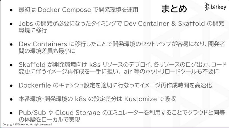 セッションで示された取り組みは、ローカル環境のみという制約の中で、いかに本番に寄り添ったCloudNative開発体験を実現するかという問いへの一つの答えだ。ビットキーのテストシステムは、当初Docker Composeによる構成から始まり、Kubernetes Jobsの開発が必要になったことを契機に、Dev ContainersとSkaffoldを軸とした開発環境へと進化してきた。