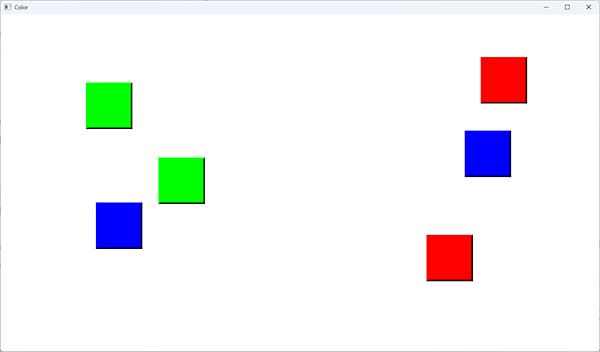 タイトル画面をクリックしたら、図3のように色ブロックを表示したメインループ画面に遷移させます。ゲームステートが「Title」の場合、OnEnter で「reset_for_title」関数を実行し、更新(Update)ごとに「title_system」関数を実行します。ゲームステートが「MainLoop」なら入り口(OnEnter)で「start_stage」関数を実行します。