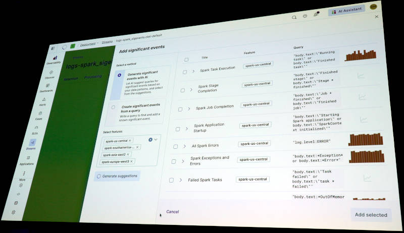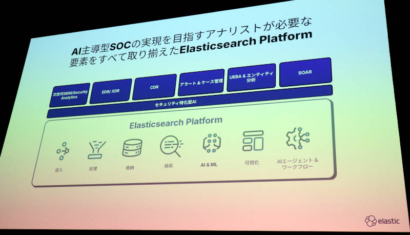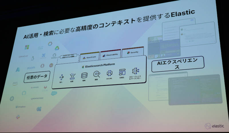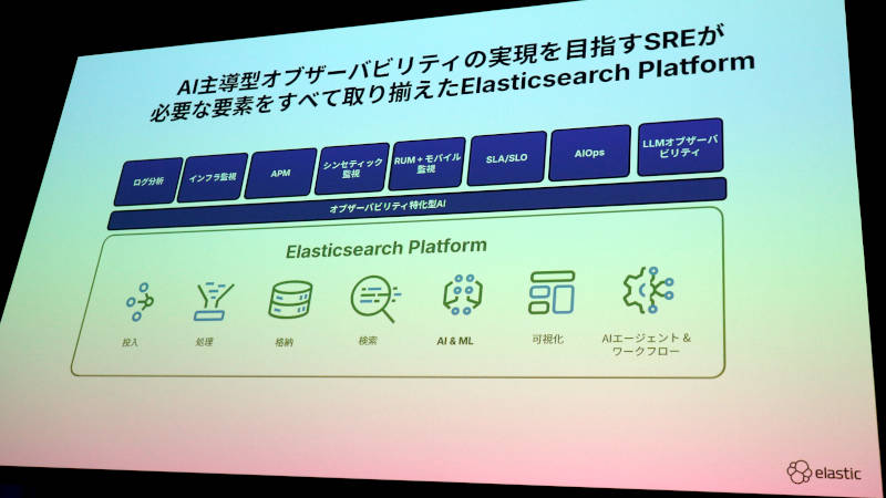 先ほどまではデベロッパー向けの訴求内容だったが、ここからはシステムを運用するエンジニア向けの機能の紹介となった。Elasticsearch Platformの機能は変えずに「オブザーバビリティ特化型AI」というやや抽象的なコンポーネントが提示されている。