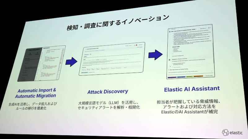 ここでの新機能はElastic Workflow for Securityという機能だ。これは検知で見つかった脅威について自動的に対処するフローを作成し、その中に生成AIによる分析などが組み込めるという内容をデモで見せた。