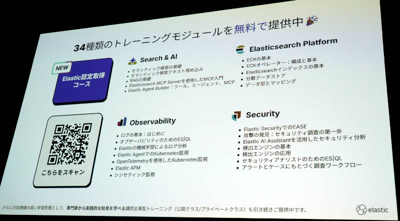 最後に紹介したのはElasticが開発した教育に関する内容だ。これは34種類のトレーニングコースを無償で提供するというものだ。