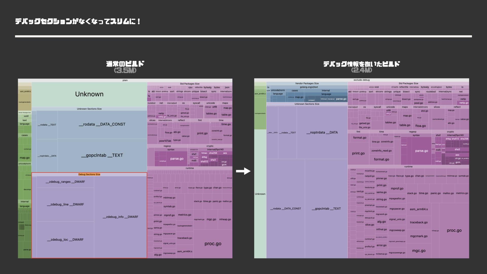 # $ make build-exclude-debug3.5Mから2.4Mにバイナリサイズが小さくなることを確認できました。次に、go-size-analyzerを用いて実際にデバッグセクションが省略されていることを確認しましょう。