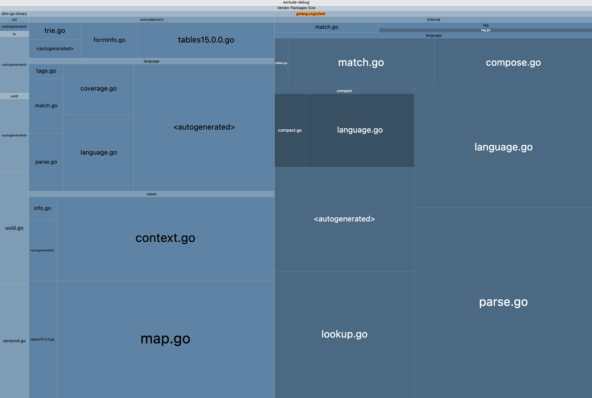 さて、先ほどの成果物におけるgo-size-analyzerのサードパーティセクションに注目すると、 golang.org/x/textという依存がサイズの9割を占めていることが分かります。