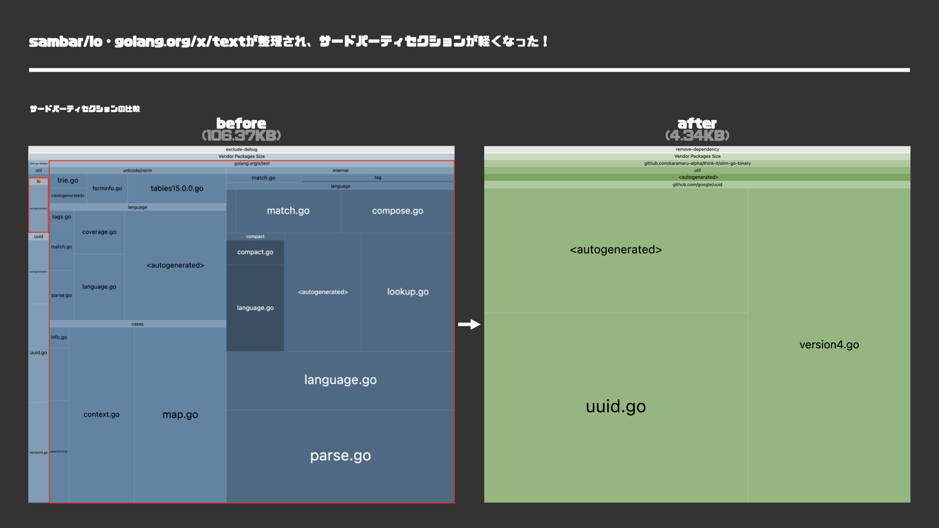 # $ make build-remove-dependencyサイズが2.4M→1.9Mになったことが確認できました。また、バイナリの内訳を表示すると、対象サードパーティパッケージが存在しなくなったことが確認できます。