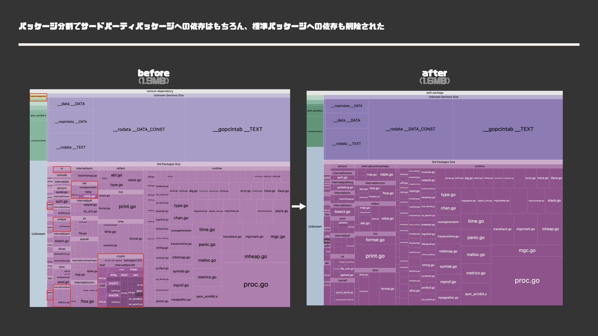 # $ make build-split-package1.9M→1.6Mに小さくなることを確認できました。内訳を確認すると、サードパーティパッケージへの依存がなくなると共に、それらが依存していたcryptやnetといった標準パッケージへの依存も合わせて削除されていることが分かります。
