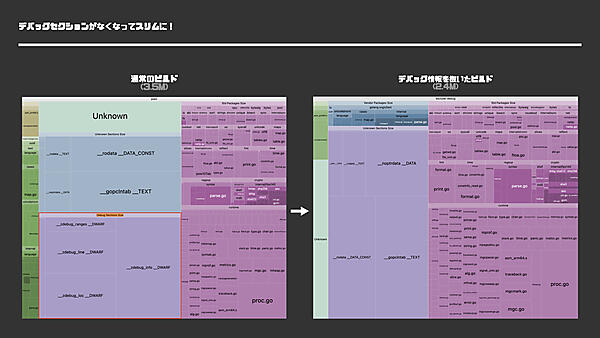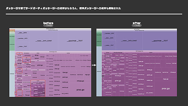 バイナリの内訳を計測して不要な依存関係が判明した際は、適切な粒度でのパッケージ分割やビルドタグの活用を検討してください。これにより、コンパイル対象となるコード/依存量を最小限に抑えることが可能です。
