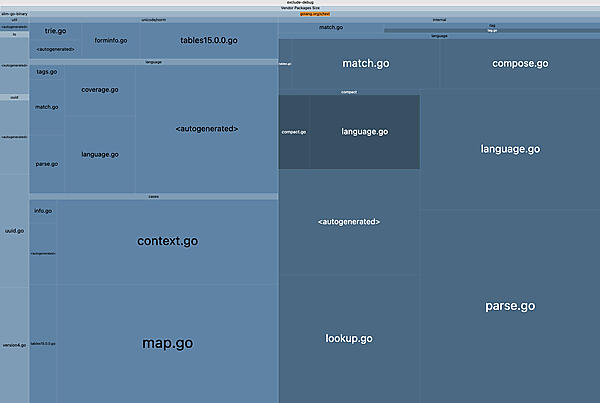 また、サードパーティパッケージのセクションに焦点を当てると、golang.org/x/textがその9割を占めていることが分かります。
