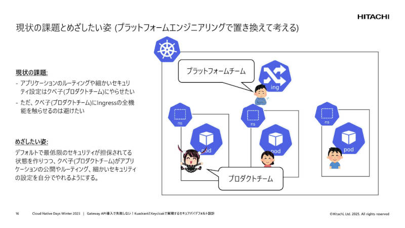 松田氏はこの状況を、決して極端な例ではないと強調する。「どうにかして、基本的なセキュリティを担保しつつ、アプリケーションの公開をクベ子に任せることはできないものか」と語り、プラットフォームエンジニアが日常的に抱える悩みであることを示した。家庭の比喩は、そのまま組織構造に置き換えられる。