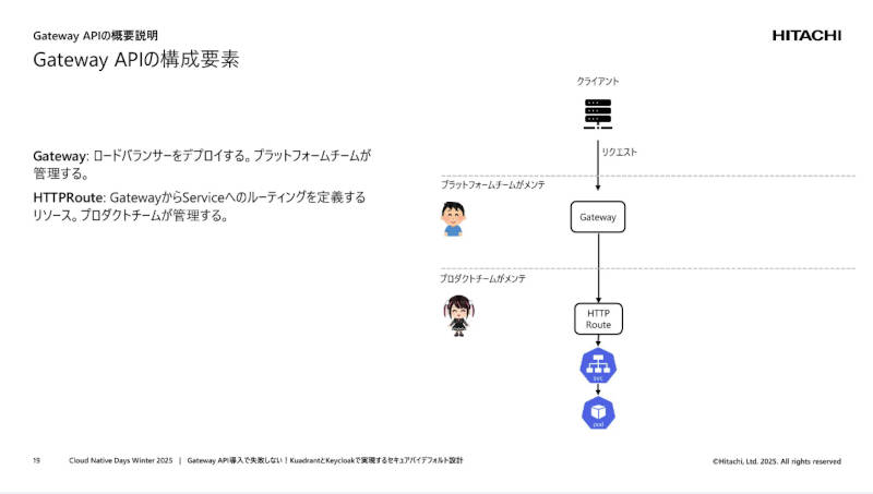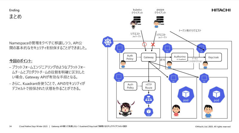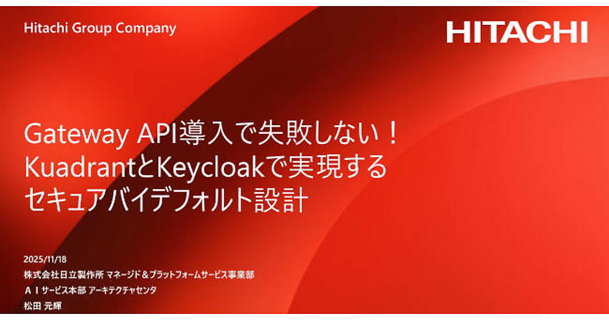 CloudNative Days Winter 2025で行われたセッション「Gateway API導入で失敗しない!KuadrantとKeycloakで実現するセキュアバイデフォルト設計」では、Gateway APIを軸に、プラットフォームエンジニアリングにおける権限分離とセキュリティ設計の実践が語られた。登壇した日立製作所の松田元輝氏は、架空の娘「クベ子」の物語を通じて、プロダクトチームに裁量を委ねながらも、事故を起こさないAPI公開を実現するための具体的な設計と実装を示した。本レポートでは、その考え方と技術的ポイントを整理する。