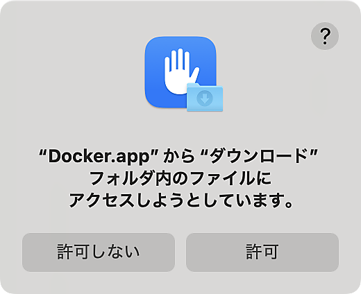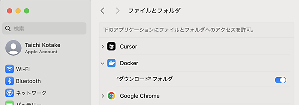 mkdir /host_mnt/Users/taichi.kotake/Downloads: operation not permitted.ユーザが付与した権限は、「システム設定」>「プライバシーとセキュリティ」>「ファイルとフォルダ」から確認できます。
