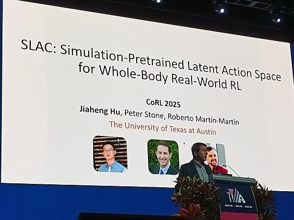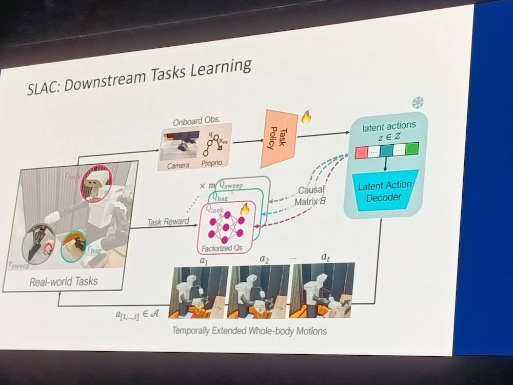 そして「未知の状況への対応」というトピックについてはCausal Reinforced Learningと自身の研究論文であるSLAC(Simulation-Pretrained Latent Action Space for Whole-Body Real-World RL)を紹介。ここではリアルな世界におけるロボットに正しい動作を学ばせることはコストが高いことを挙げて、それを克服するための手法、SLACを紹介した。