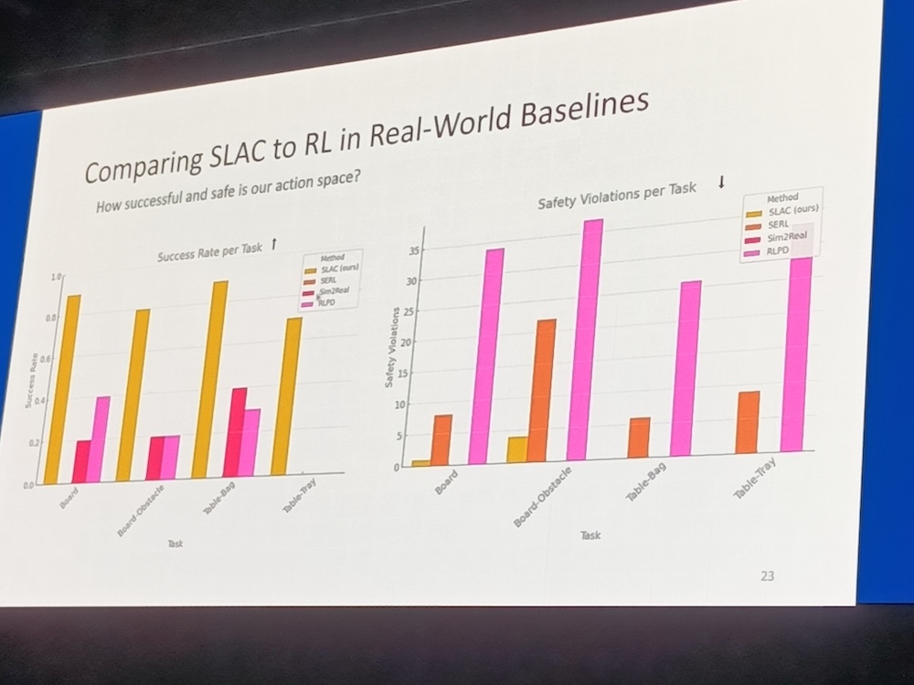 また、研究者らしくSLACと他の手法を比較したグラフを紹介し、SLACがSim2Realなどに比べて高い成功率を誇ることを示した。
