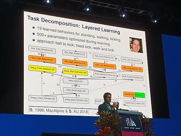 Stone氏は自律的ロボットによるサッカーゲームであるロボカップの動画を再生し、自律的に複数のロボットが動いてゴールにボールを入れる、それを防ぐという動作が可能になっていることを例として示した。また、ロボット対人間のサッカーゲームも紹介。ここでもロボットが人間の動作を予想してゴールを決める例が紹介された。またSonyのゲーム、グランツーリスモにおいてAIが運転する車が人間が運転する車に抜かれないようにブロックする動画も紹介し、レースに勝つためには抜くだけではなく抜かれることを妨害するという動作をAIが学習可能であることを示した。