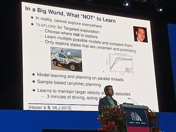 「タスクが難しい、領域が広いこと」についてはタスクを分解していく方法を解説。タスクを分けていくだけではなく複数のレイヤーに分離していくLayerd Learningを解説した。ここでは前出のロボカップの動作を分解するダイアグラムを例に挙げて説明を行った。またチェスのルールを学ぶAutomated Curriculum Learningも説明。そして領域が広すぎるという課題については同僚のTodd Hester氏と発表したTEXPLOREという研究を引用して解説。ここでは「現実世界では強化学習によってロボットを制御する際に何を学ばないのか?」を選択することが重要であることを説明した。