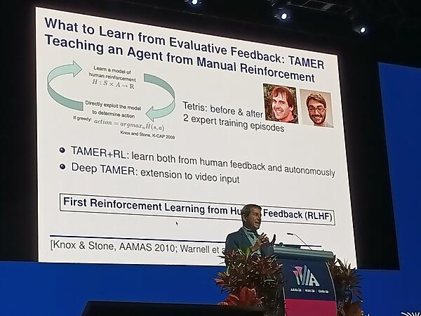 最後のトピックとなる「人間と協調すること」についてはTAMERを紹介。ここでは人間がAIの動作を評価することで学習を改善するという発想だが、これは強化学習に人間のフィードバックを使うRLHF(Reinforced Learning Human Feedback)の最初の研究であると説明した。
