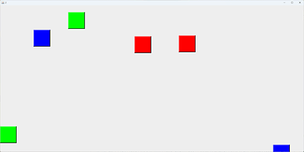 色ブロックの(pos[0],pos[1])は(X,Y)座標、(delta[0],delta[1])は(増分X,増分Y)座標です。それぞれ初期値にはランダムな値を入れます。