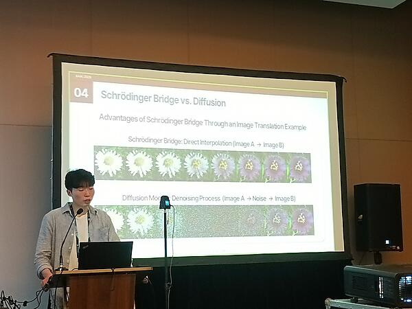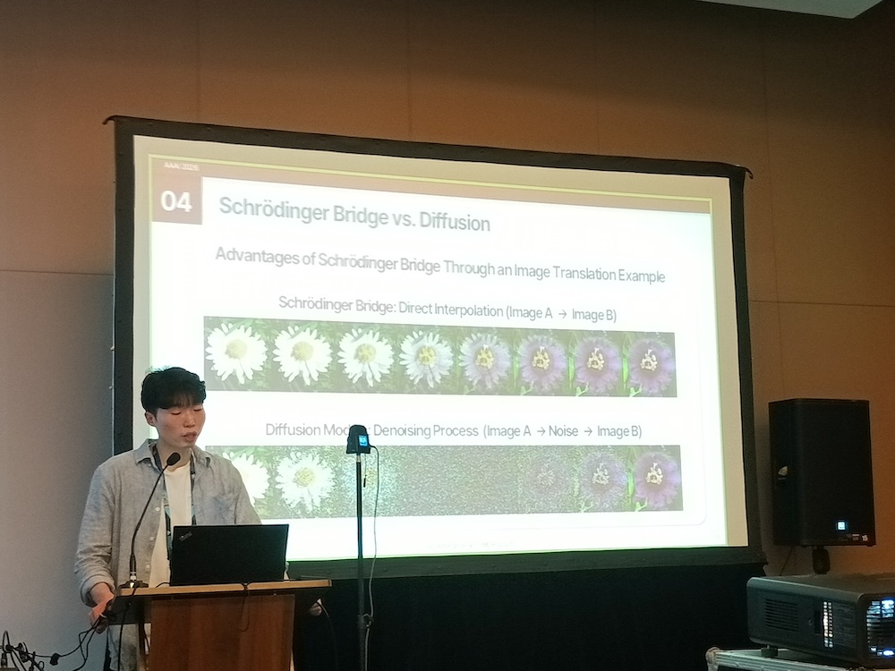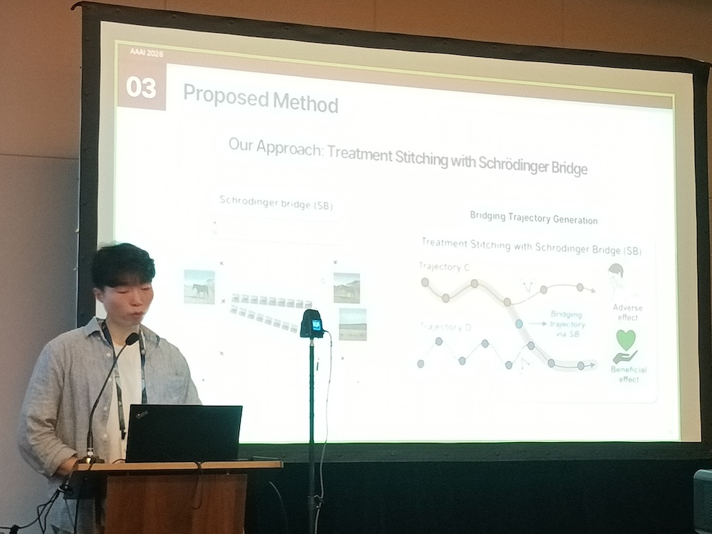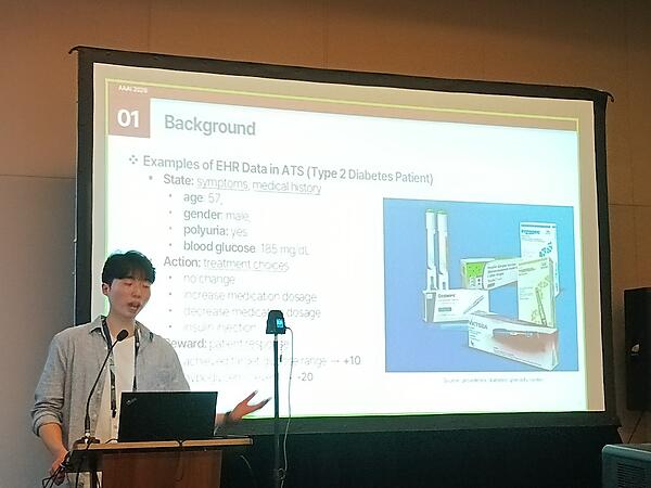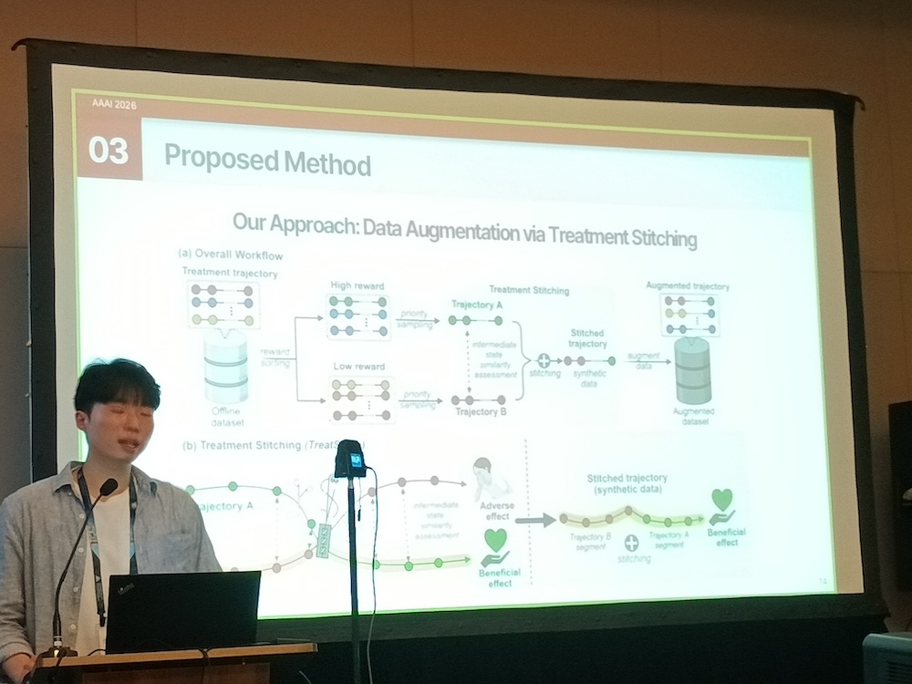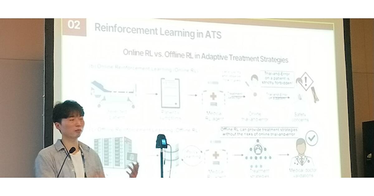 「Treatment Stitching with Schrödinger Bridge for Enhancing Offline Reinforcement Learning in Adaptive Treatment Strategies」、発表者は韓国大学の研究者だ。このセッションでは糖尿病を例に挙げて治療を症状に応じて段階的に行う適応的治療戦略(ATS)にオフライン強化学習による新しいアプローチを使うという内容となっている。