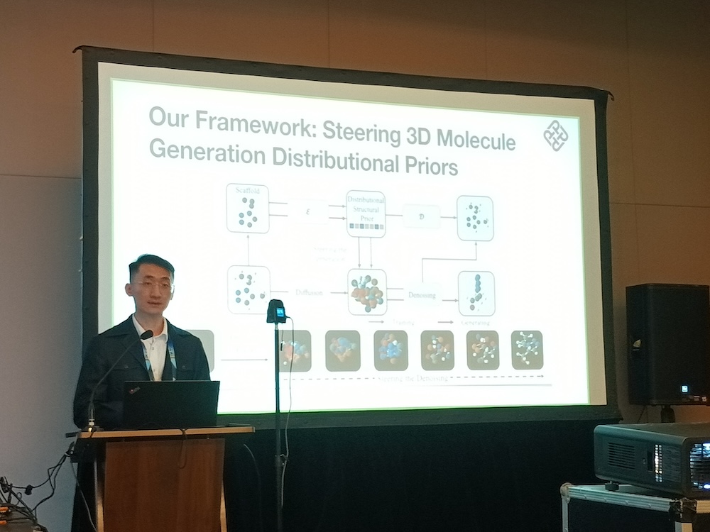 次のプレゼンテーションは「Distributional Priors Guided Diffusion for Generating 3D Molecules in Low Data Regimes」、発表者は香港理工大學の研究者だ。