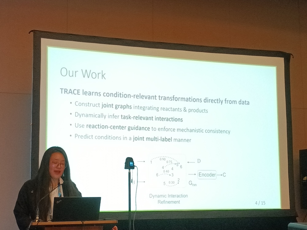 次のプレゼンテーションは「TRACE: Transformation-Aware Graph Refinement for Reaction Condition Prediction」というタイトルで、これも発表者は湖南大学、澳門理工大學などの研究者だ。