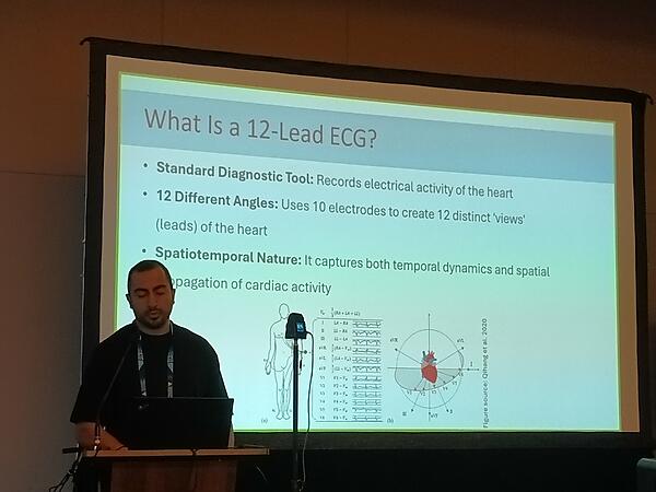次のプレゼンテーションはイスラエル工科大学の研究者によるもので「PDE-Driven Spatiotemporal Generative Modeling for Multilead ECG Synthesis」というタイトルになっている。複雑な心電図のアウトプットの理解を促進するための新しい手法を提案している。