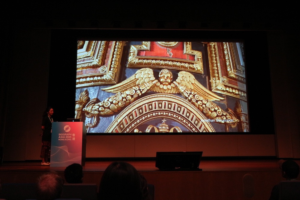 Yin氏は実際にAdobe Substanceを使って生成されたオブジェクトを動画で紹介。ここでは金のレリーフで飾られた壁の一部を紹介した。単に形状だけではなく光の反射、影、質感などを実写と同じレベルで作成できることがポイントだ。