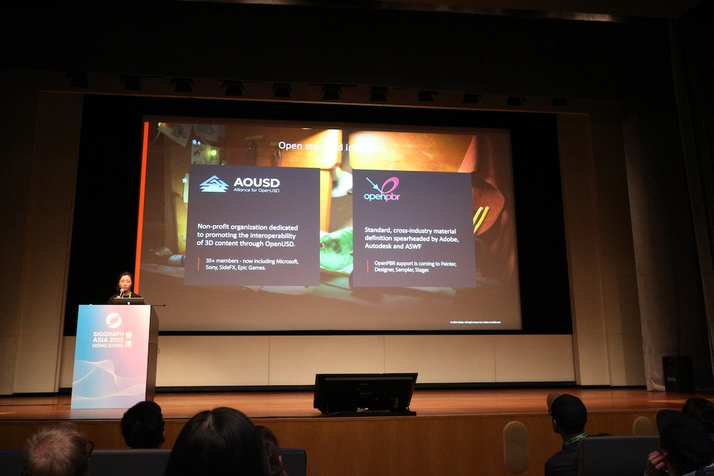 ここでAdobe Substanceにとって重要な「オープン」に関する内容が解説されている。このスライドで挙げられているOpenUSDはUniversal Scene Description(USD)のオープンな仕様、OpenPBRはThe Linux Foundation(LF)配下のAcademy Software Fooundation(ASWF)が公開しているPhisically Based Rendering(PBR)のオープンな仕様ということになる。