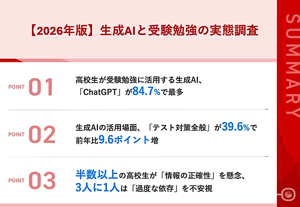 「【生成AIと受験勉強の実態調査2026】ChatGPT利用率が84.7%で首位!一方で「情報の正確性」への不安は52.3%と2025年に比べ13.3ポイント増」(PR TIMES 2026/01/23)
