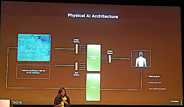 次に、その物理AIがどのようなアーキテクチャーで構成されるのかを説明。ここではカメラで獲得したデータ(床の上の箱の写真)をイメージトークンとして使い、それに対して言語によるトークン、例えば「目の前の箱を移動しろ」というテキストトークンを使い、それをワールドモデルの中でシミュレーションした上で実際に物理のロボットが操作、その結果をワールドモデルに反映し、結果をリワードとして返すことでその操作が良い選択だったのかを反映して、次の操作のためのループが繰り返されると説明。認識→操作→評価というループを繰り返すことで、ロボットの行いが改善されていくという原理である。