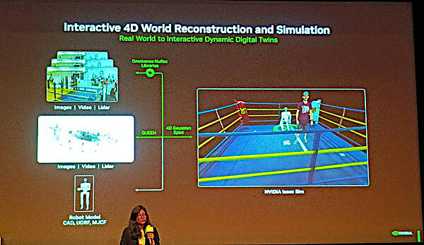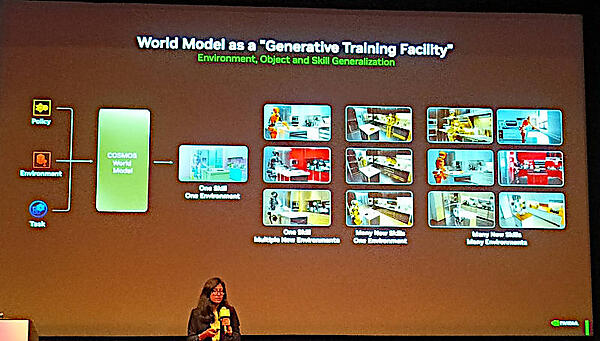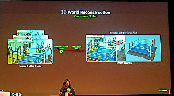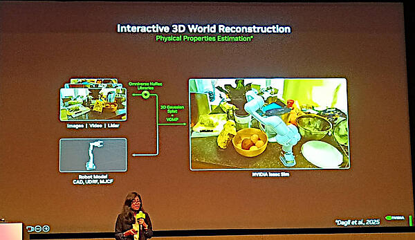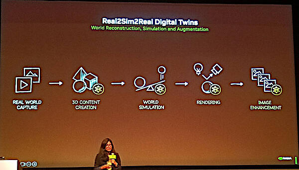 ここではリアルな世界を認識したうえで、それをシミュレートされた世界として構築することが必須となると説明。ロボットが認識する世界をリアルな状況に限りなく近く再現することが必要であることが強調されている。Real2SimやSim2Realに関しては論文が発表されているが、リアルな世界をシミュレーションに移したうえで再度、リアルな世界での操作に反映するという発想(Real2Sim2Real)が物理AIを実現するためのNVIDIAとしての解答ということになる。