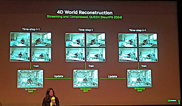このスライドで引用されているQUEENはNVIDIAのホームページにも解説があるが、元となった論文はNuerIPS 2024として2024年12月にバンクーバーで開催された学会で発表された「QUEEN: QUantized Efficient ENcoding of Dynamic Gaussians for Streaming Free-viewpoint Videos (NeurIPS 2024)」だ。この論文にはこのセッションのプレゼンターであるDe Mello氏も著者として明記されている。NVIDIAのページは以下を参照して欲しい。