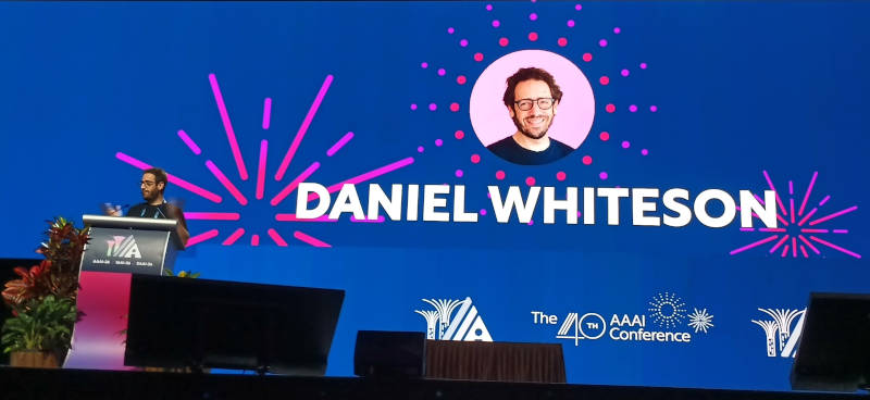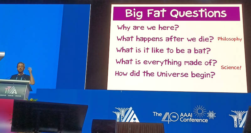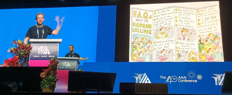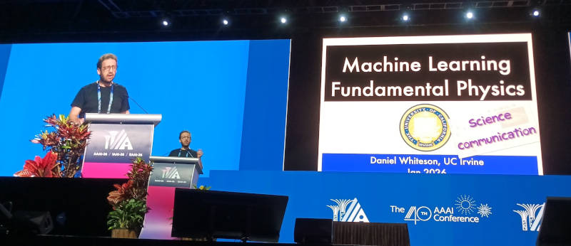 人工知能の国際会議、AAAI-26の2日目に行われたInvited Talk、「Fundamental physics and science communication」と題されたセッションを紹介する。プレゼンターはカリフォルニア大学アーバイン校のDaniel Whiteson教授だ。タイトルは「物理の原理とサイエンスコミュニケーション」という意味だが、実際には機械学習によって物理の原理を解明した事例を紹介した部分と、サイエンスコミュニケーションが必要なことを学生に訴える部分に分かれている。AAAI-26の参加者が機械学習については熟知していることを考えると、後半のサイエンスコミュニケーションが最も伝えたい内容だったのではないだろうか。