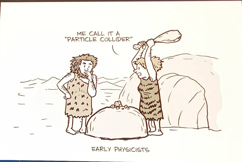 原始人のイラストで描かれた「石を砕く」動作を素粒子物理学的な用語(Particle Collider)を用いて表現し、ここからCERNの大型ハドロン衝突型加速器(Large Hadron Collider)に始まる物理の原理究明に繋がるエピソードを解説した。