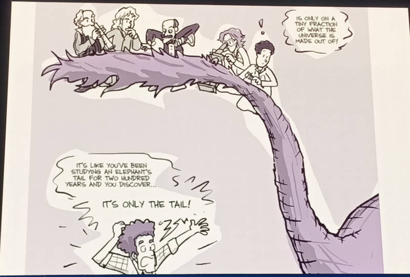 このスライドでは宇宙の5%は解明されており、27%はダークマターと称される物質であるとわかっているが、残りの68%はそれが何であるのか? 想像がついていないと説明した。