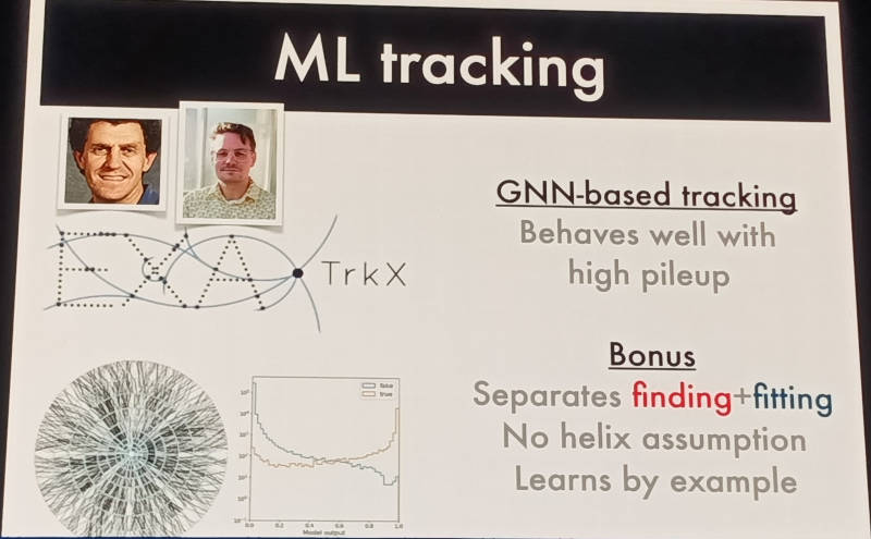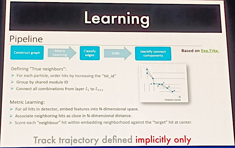 そこでデータを追跡する手法としてグラフニューラルネットワークを使ったExa TrkXを紹介。これは高エネルギー物理学の実験としてアメリカのエネルギー省が推進しているLHCで観測される素粒子が飛行する軌跡の解析にグラフニューラルネットワークを使った研究である。