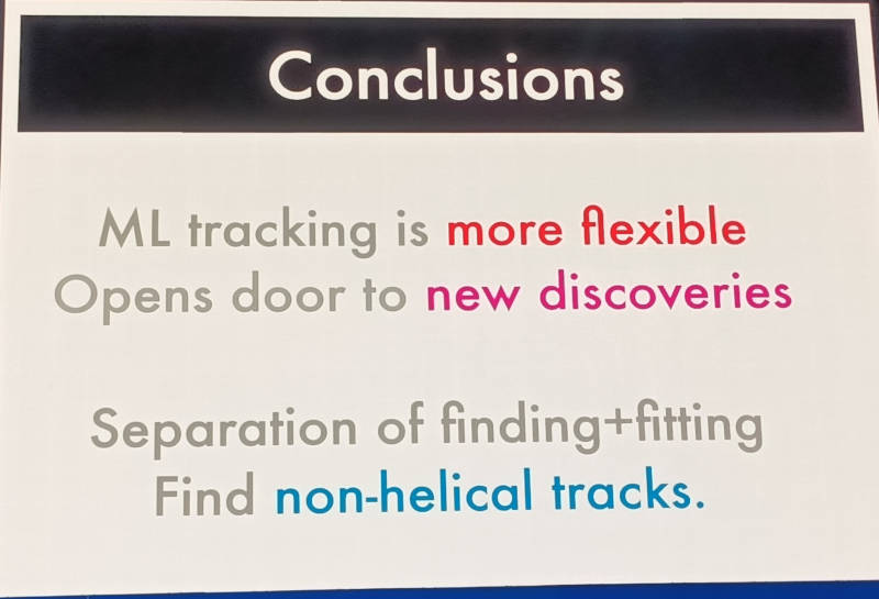 さまざまな粒子の飛行軌跡を紹介し、それを理論化する苦労などを解説したうえで前半のまとめとして機械学習による軌跡解析は柔軟であり、新しい発見を行うことが可能となったと説明した。