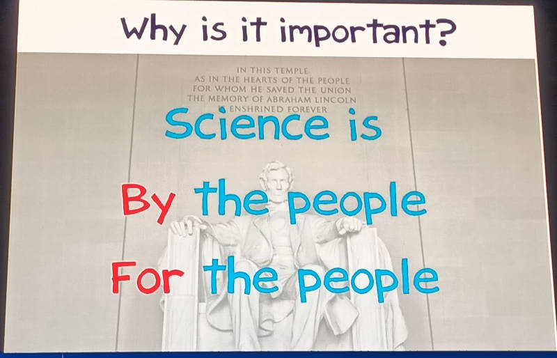 ここではリンカーン大統領の像を背景にして民主主義の原則を説いたゲティスバーグ宣言の一文、「Government of the people, by the people, for the people」を使って、サイエンスはすべての人のために行われるべきであることを説明。